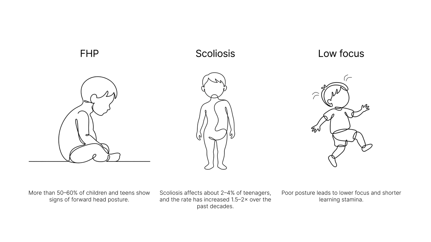 미디어의 급격한 발전과 사회적 트렌드의 변화로 인해, 아이들은 신체 활동에 보내는 시간은 줄어든 반면 화면 앞에서 보내는 시간은 크게 늘어났습니다. 그 결과, 하루 대부분의 시간을 앉아서 보내게 되었습니다. 이러한 환경 속에서 아이 스스로 건강한 자세를 유지할 수 있는 능력은 그 어느 때보다 중요해지고 있습니다.